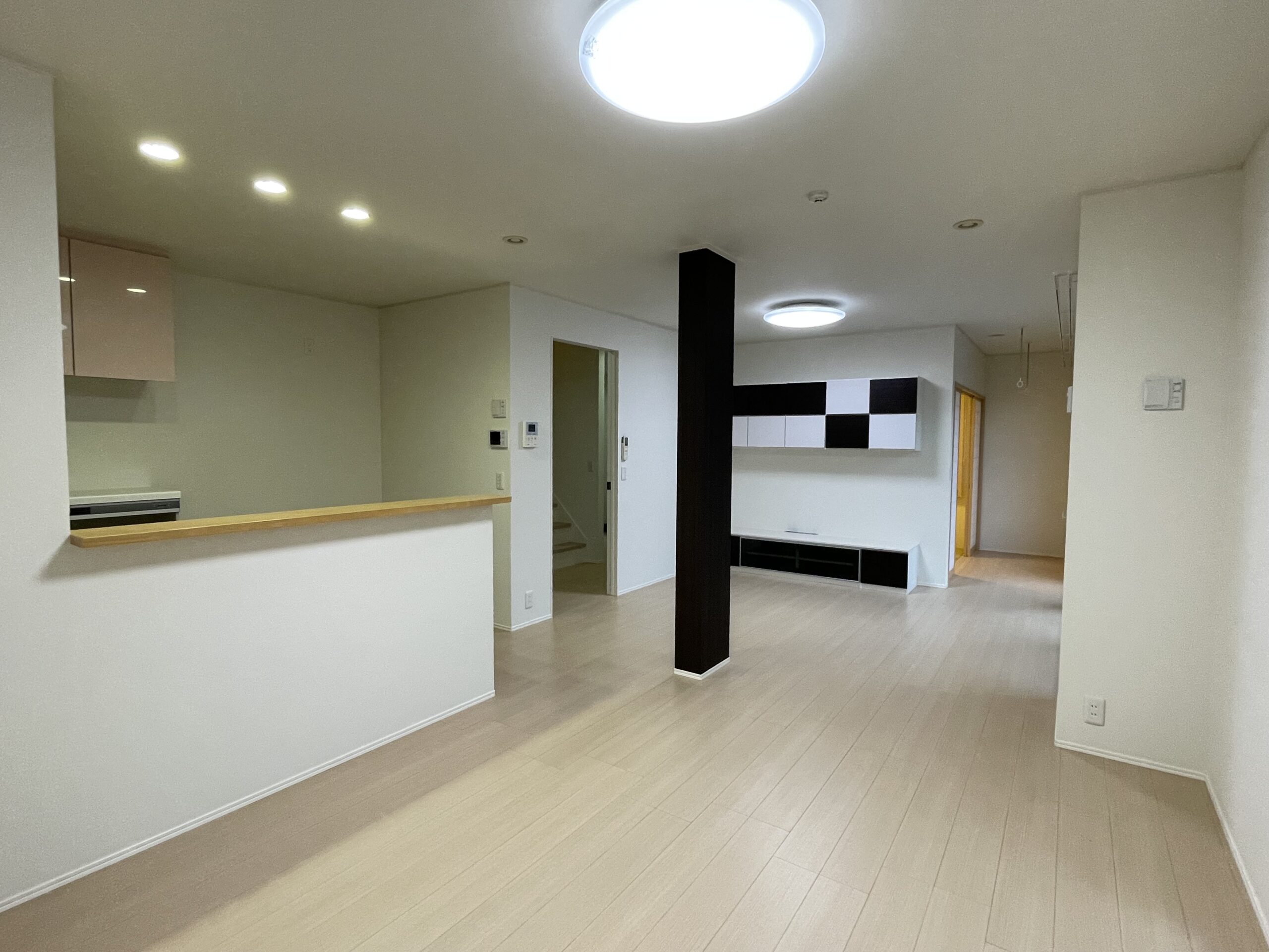 19帖のLDKに白黒が目を引くお洒落なTV棚、収納たっぷり機能的なキッチン
