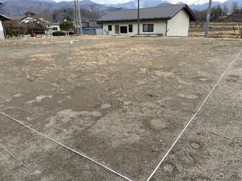 常念岳などの北アルプスが眺められる、907㎡の平坦な敷地。建築可能な土地です。