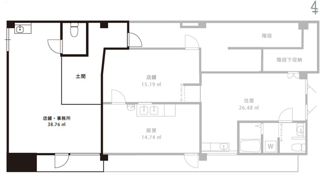 担当からのコメント | 入口側に販売店舗や事務所の商談スペースとして活用できる土間付きのオフィス・店舗用の区画です。フリーランスや開業を考えている士業、S E 、デザイナーなどの事務所としてやクリエイターのアトリエ、販売店舗に。簡易キッチン付き。24時間ゴミ出し可。 |