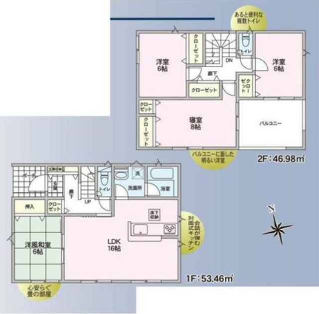 | 設備 | 温水洗浄便座/浴室乾燥機/システムキッチン/カウンターキッチン/床下収納/モニター付インターホン/火災報知器/プロパンガス/ルーフバルコニー/複層ガラス/駐車場 | ||||