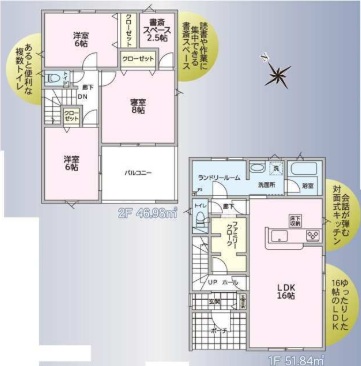 | 担当からのコメント | ランドリールームでは洗濯作業が一か所で行えます。また、廊下をはさんだ場所にファミリークロークがあるので、洗濯の終わった衣類をそのまま収納することも出来ます♪2階は洋室3室に加えて趣味や勉強に集中できる2.5帖の書斎スペースあり! | ||||